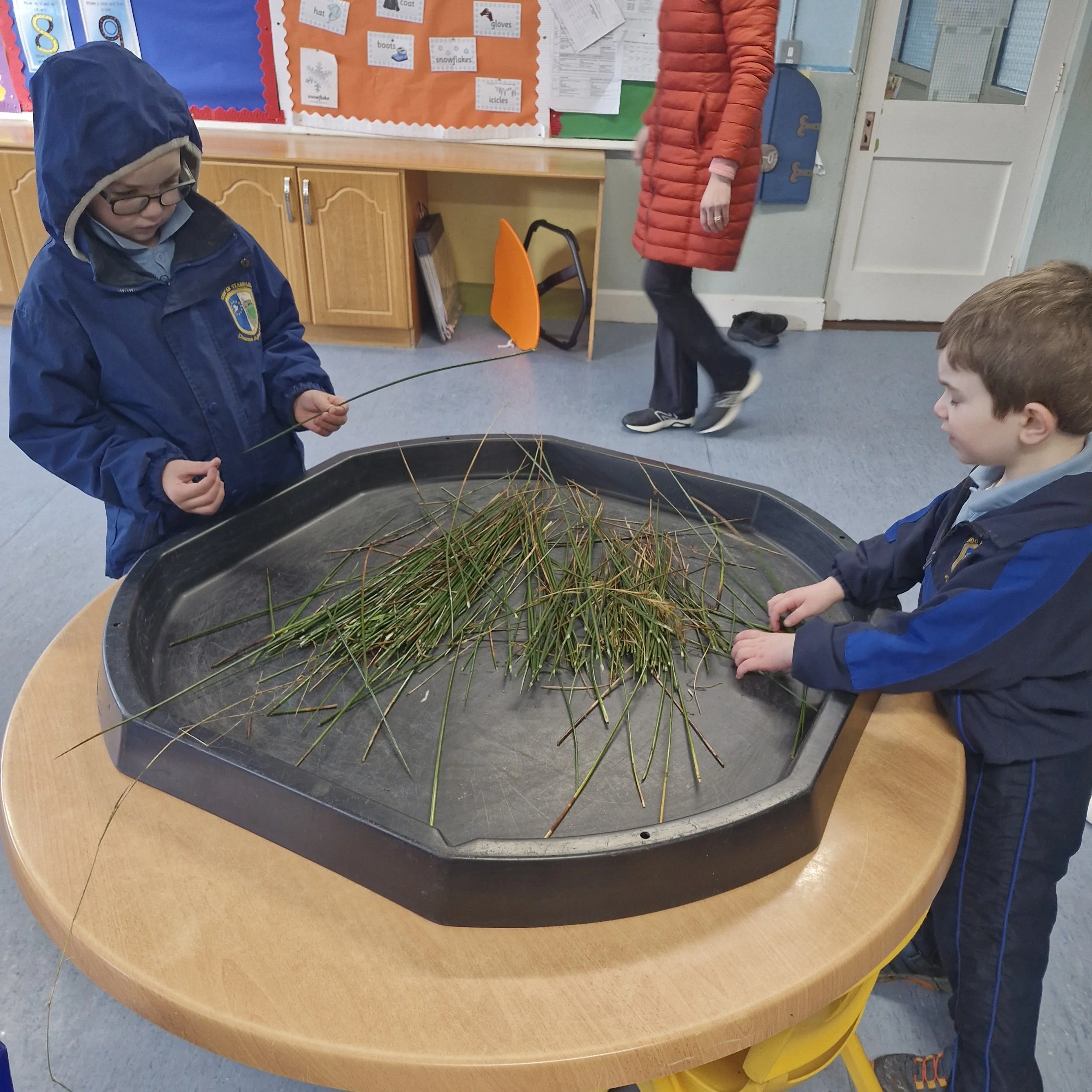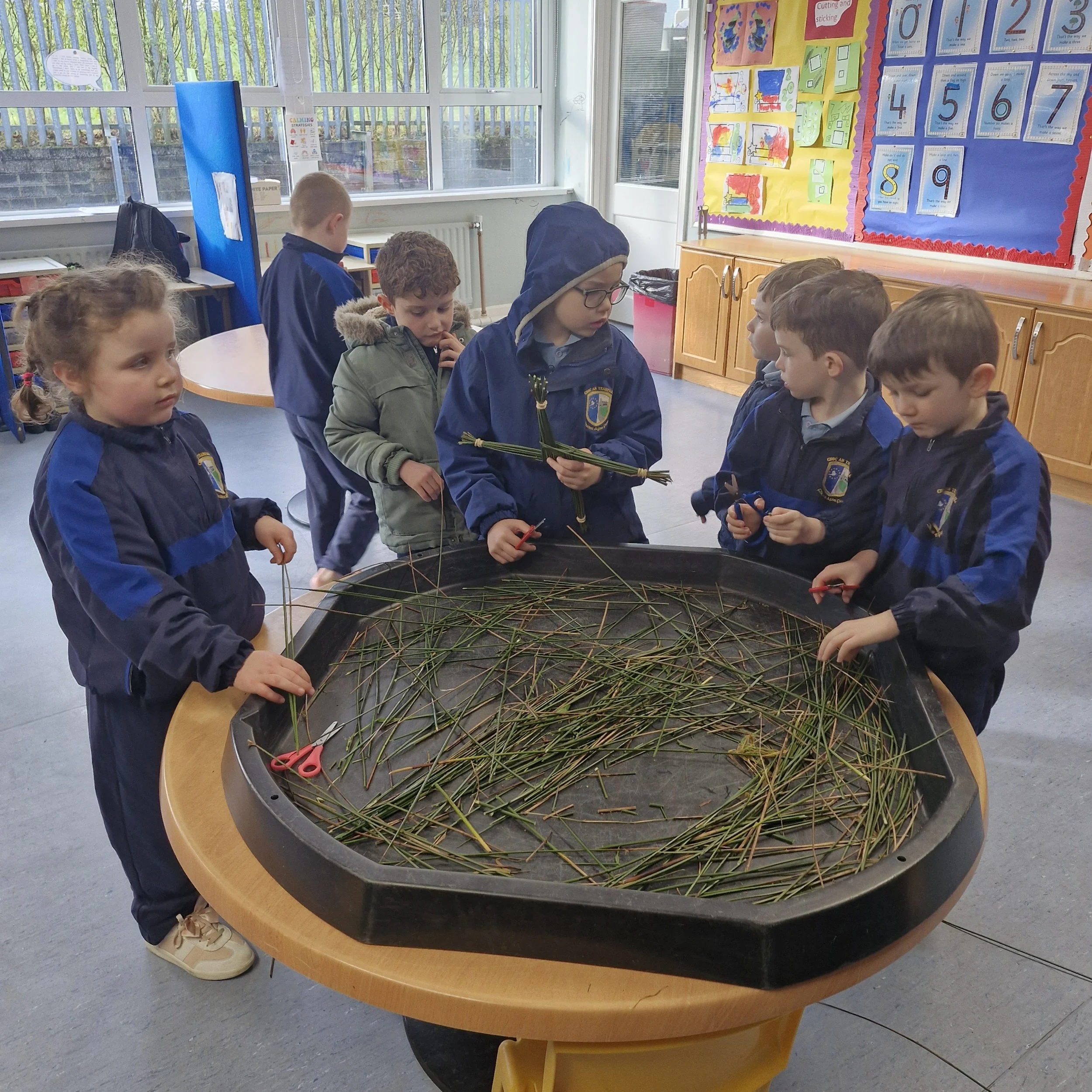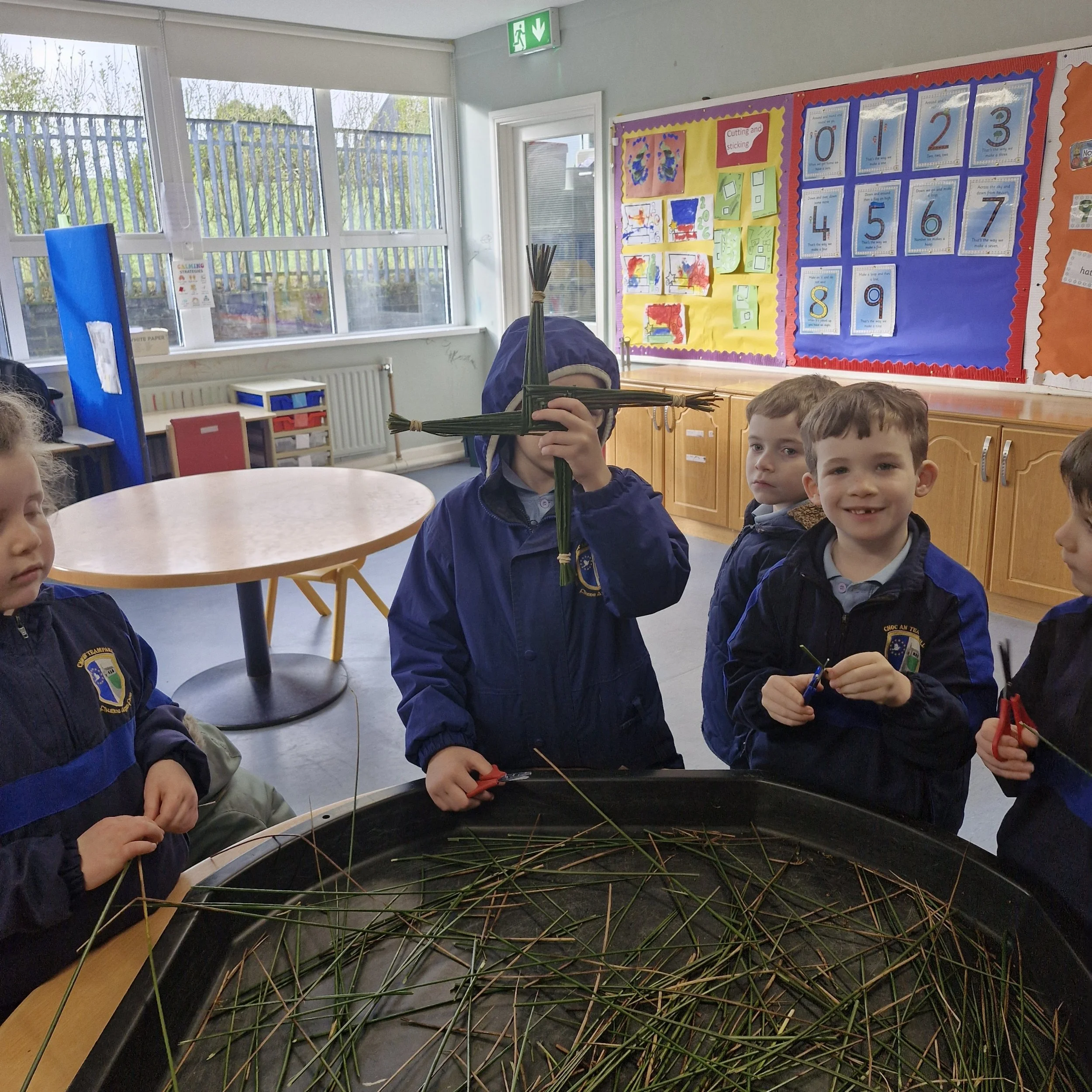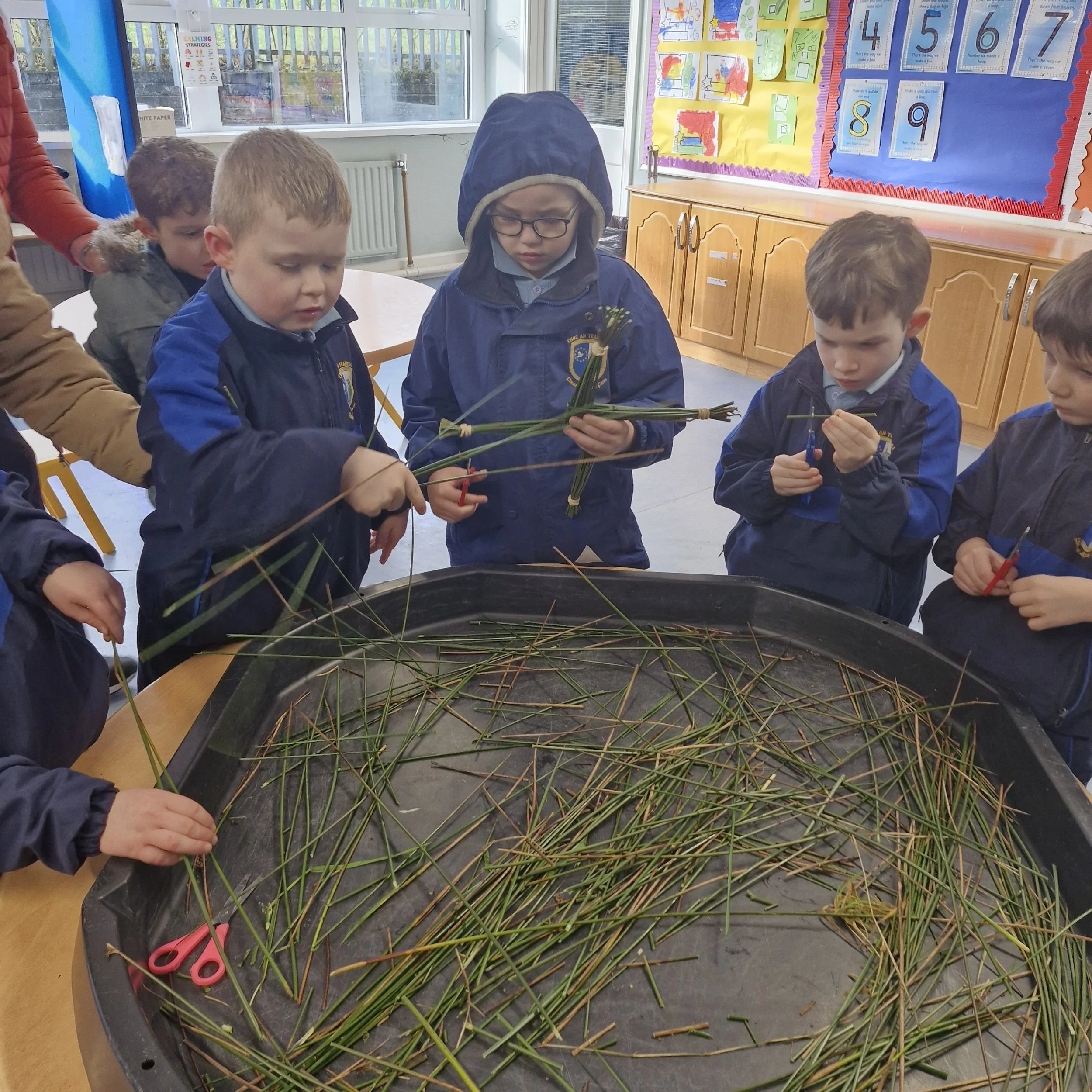 Despite two school closures, we still had a very busy week. We were back in the kitchen where we followed visual recipes to make smoothies. Not everybody wanted to taste them but everybody was very interested in the process. We delivered the spare blueberry and banana smoothie to Cairde 2 to sample. We also made lava lamp solution using oil, milk and food colouring. As it will be St.Brigid's Day next week, we collected rushes on our walk. Then we made crosses with our friends from senior infants during reverse integration. We later went to some of the classes to show them off.