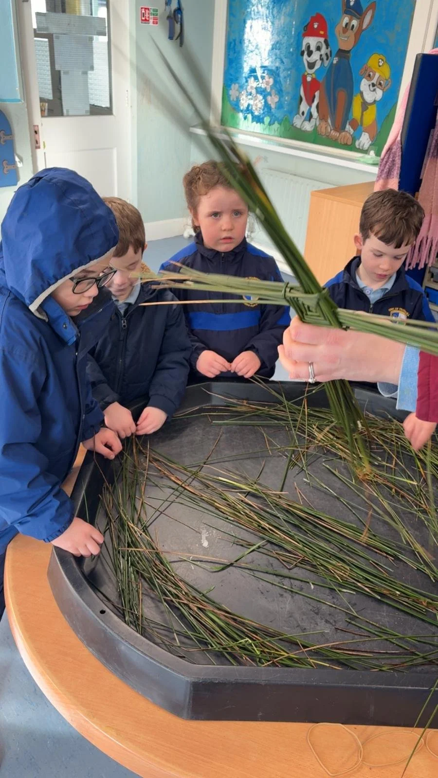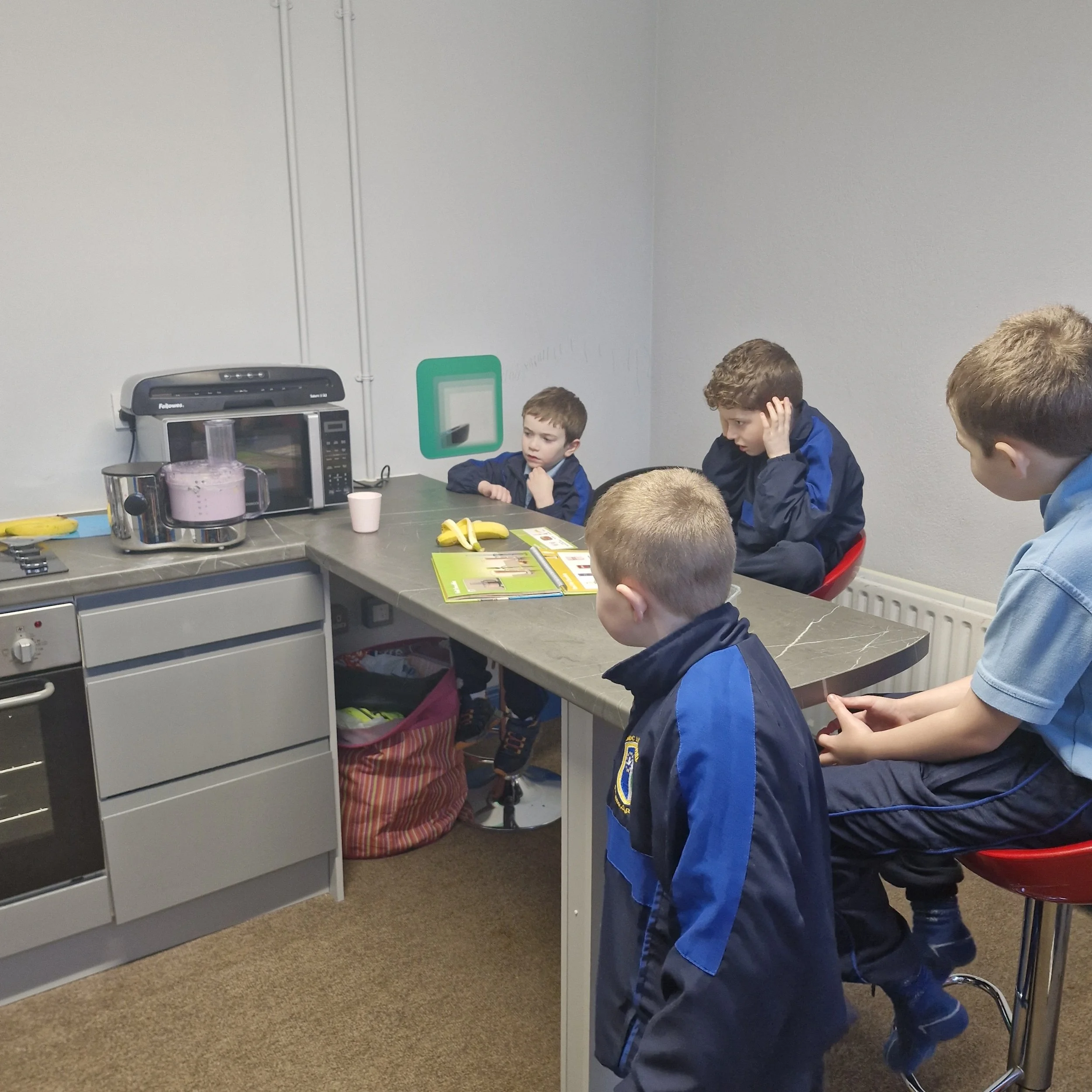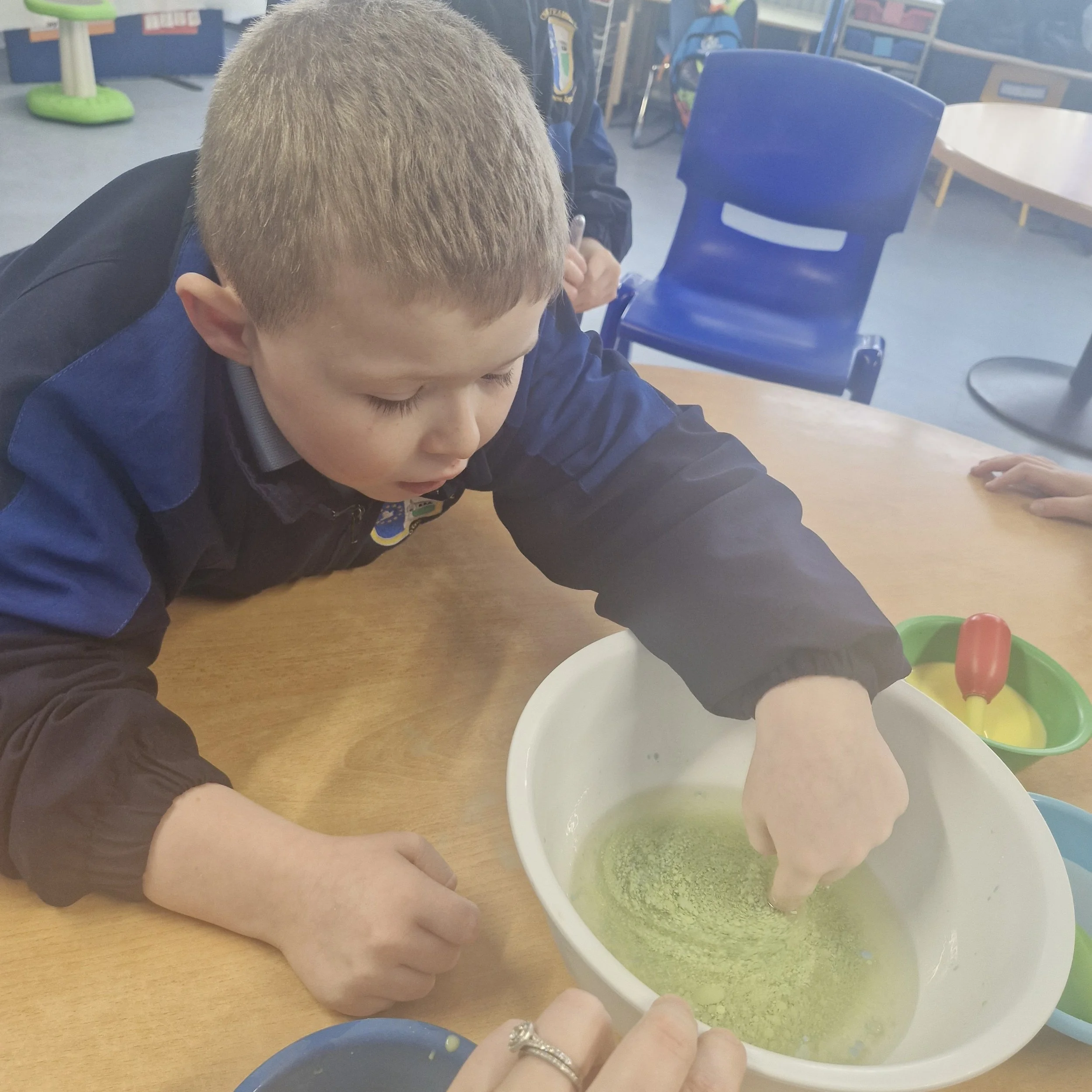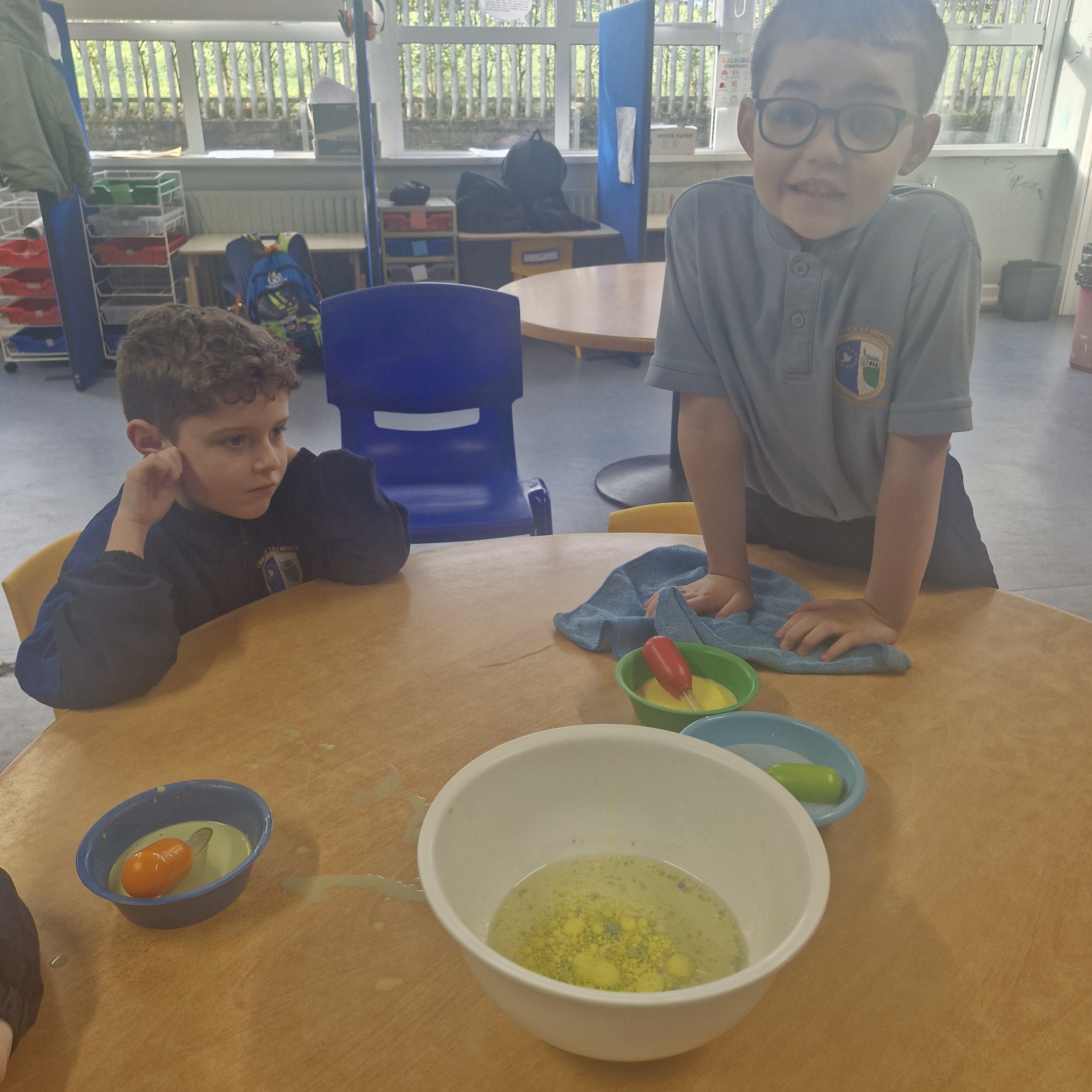 Despite two school closures, we still had a very busy week. We were back in the kitchen where we followed visual recipes to make smoothies. Not everybody wanted to taste them but everybody was very interested in the process. We delivered the spare blueberry and banana smoothie to Cairde 2 to sample. We also made lava lamp solution using oil, milk and food colouring. As it will be St.Brigid's Day next week, we collected rushes on our walk. Then we made crosses with our friends from senior infants during reverse integration. We later went to some of the classes to show them off.